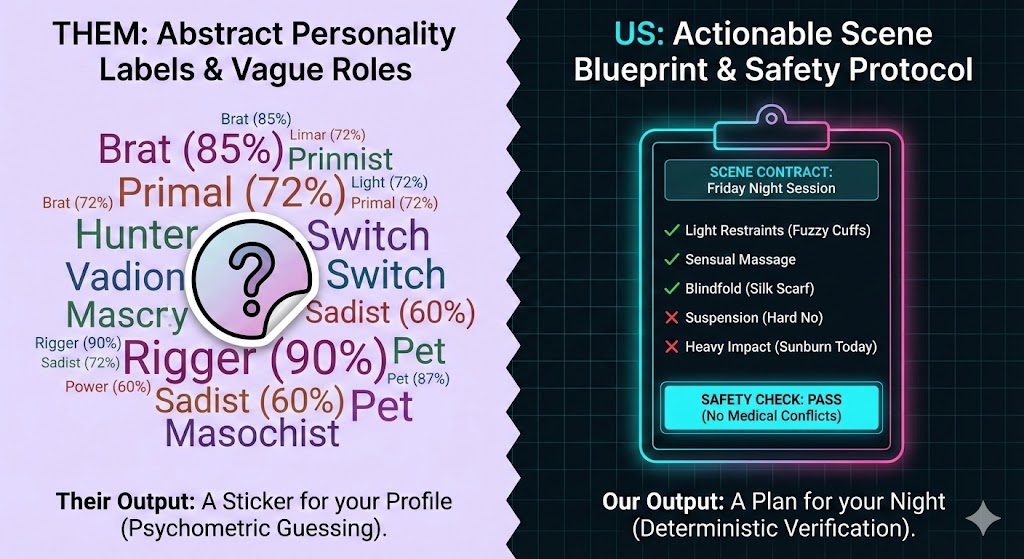 BDSMTest is a Psychometric Sorter. It uses broad strokes to guess your “Role” (Identity). It’s great for self-discovery (“Oh, that’s why I like that!”), but it is incapable of providing a workable scene.