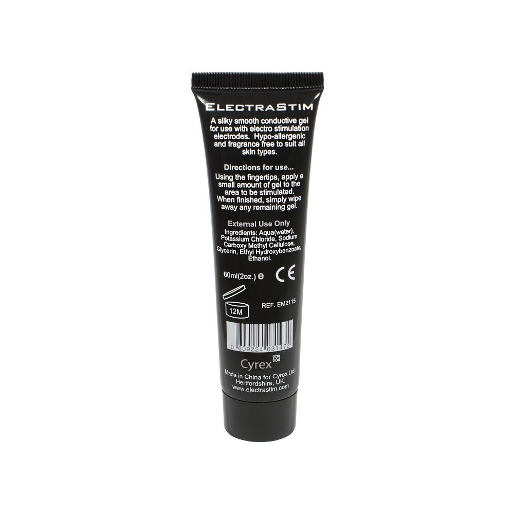 Electrastim Conductive Gel for all your conductive electrosex needs. Please note that electrical play products are not to be used on persons with heart conditions. Ingredients: Aqua (Water), Patassium Chloride, Sodium Carboxy, Methyl, Cellulose, Glycerin, Ethyl Hydroxbenzoate, Ethanol