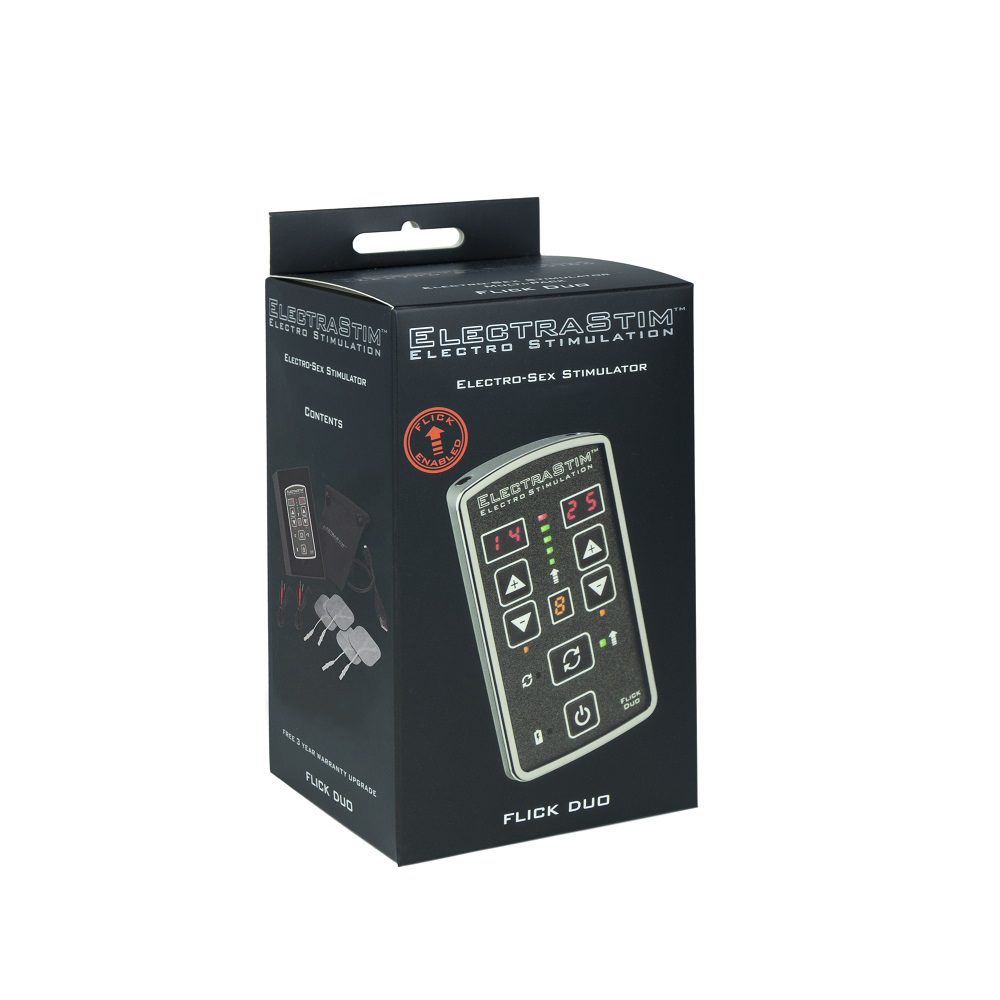 ElectraStim Flick Duo Info A revolution in electro stimulation technology the ElectraStim Flick Duo not only has 8 built-in dual channel programs including escalating patterns but is also able to stimulate in rhythm with the movements of the control unit! Whether you simply want to add your own stimulation “beat” or want to stimulate in direct sympathy with your own wrist movements during masturbation, this patent pending feature will be like nothing you have tried before! The Flick feature can be slow or fast, soft or hard – it will mimic the sensation that suites your, or your partners, desire. The Flick Duo unit has 25 intensity levels per output, ensuring satisfaction for all levels of play. Flick Feature Pressing the Mode button for 3 seconds will take you into the Patent Pending Flick feature. Simply make motions with the control unit to vary the strength of stimulation but you still have control over the maximum intensity level. The Flick level is indicated by the 5 LEDs on the control panel but the output actually has 50 flick strengths! There are 4 different Flick Modes on the Duo Stimulator. Stimulation Patterns/Programs The stimulation mode or pattern can be changed by briefly pressing the Mode button. Each press will cycle through the eight stimulation patterns and the yellow output activity lights will glow in sympathy with the stimulating output. The Duo programs have been specially developed to wave and pulse between the two outputs, giving an enhanced and dynamic electro stimulation experience. Flick Duo Programs Continuous – smooth stimulation to get the feel of things Alternating Wave – slow and gentle wave/massage effect sweeping between the two outputs Escalating Simultaneous Wave – starting with a slow wave and steadily speeding up to a fast wave before slowing down again Alternating Pulse – a low frequency bursting pattern Escalating Simultaneous Pulse – starting with a slow pulse and steadily speeding up to a fast pulse before slowing down again Simultaneous Falling Rest – pulsing pattern with an ever decreasing rest period until the stimulation is constant then repeating Alternating Dual Pulse – medium burst rate followed by a fast rate… Rapid Fire Escalate – firing an increasing number of pulses to each output before starting again Flick Modes Flick 1 – Output 1 is Flick Sensitive Flick 2 – Output 2 is Flick Sensitive Flick Both – Output 1 and 2 are both Flick Sensitive Flick to Switch – Flick motions above level 1 will alternate the active output Other Key Features Powerful, Controllable Dual Channel Stimulation USB Charger Input – No Batteries Required! FREE 3 Year Warranty Upgrade Soft Touch Power Box Charge Status Indicator Light Intensity Level Soft Start Feature Low Battery Warning Durable Control Panel High Quality Packaging
