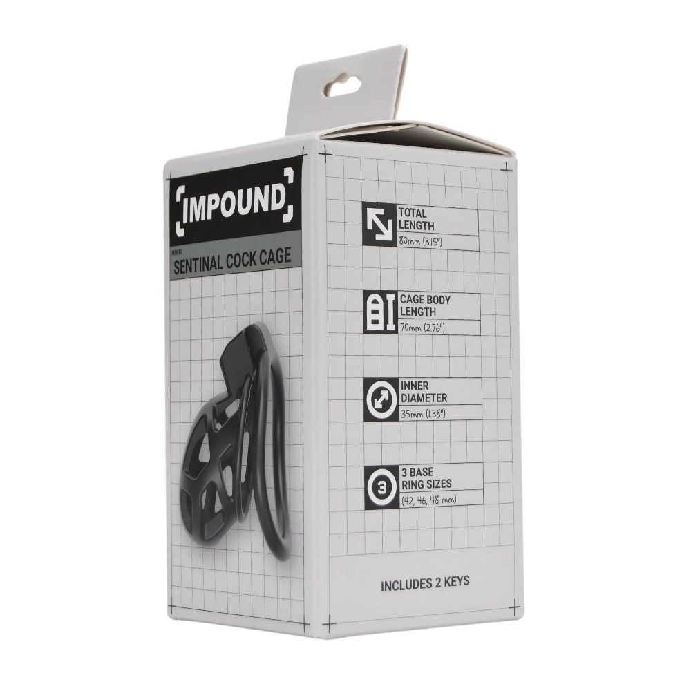Slim, lightweight, and built for secure submission – the Impound Sentinel Cock Cage is designed for discreet chastity play without compromising on restraint. With a sleek and compact 80mm profile and an airy, open-vented structure, it’s ideal for long-term wear and hygiene. The 35mm inner diameter provides a snug fit, while three interchangeable base rings ensure maximum comfort and control. Made from ultra-light ABS with a touch of metal reinforcement, the Sentinel weighs just 28.5g – making it a perfect choice for beginners and pros alike. Features: